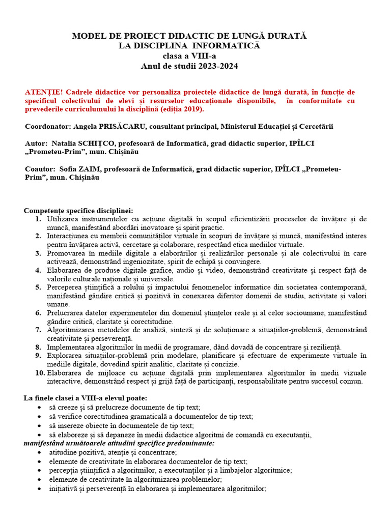 ATENȚIE! Cadrele didactice vor personaliza proiectele didactice de lungă durată, în funcție de