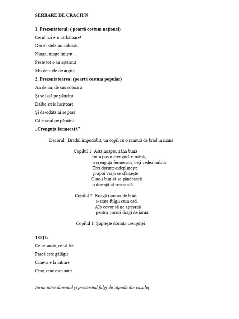 Iarna intră dansând şi presărând fulgi de zăpadă din coşuleţ.