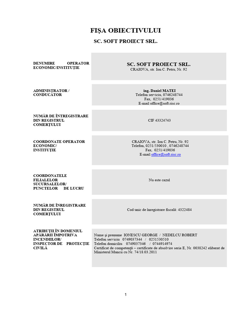 apărarea împotriva incendiilor la S.C. PRO SOFT S.R.L..
