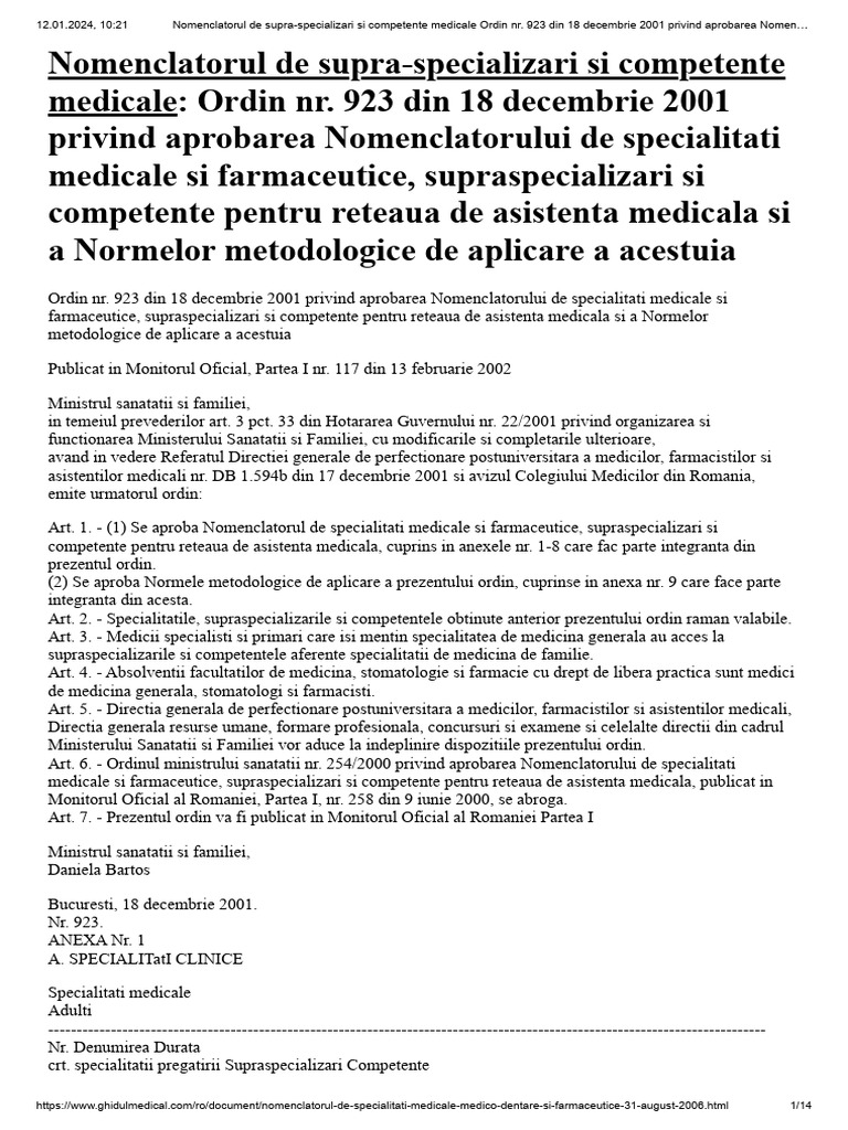 12.01.2024, 10:21 Nomenclatorul de supra-specializari si competente medicale Ordin nr. 923 din 18 decembrie 2001 privind aprobarea Nomen…