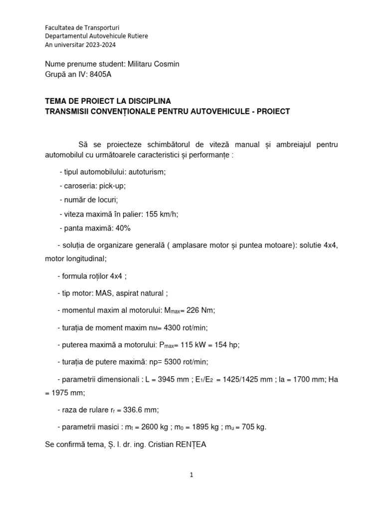 Calculam ratia pentru etajarea schimbatorului de viteze: q = √ 𝑖𝑠𝑁 = √3.837 =