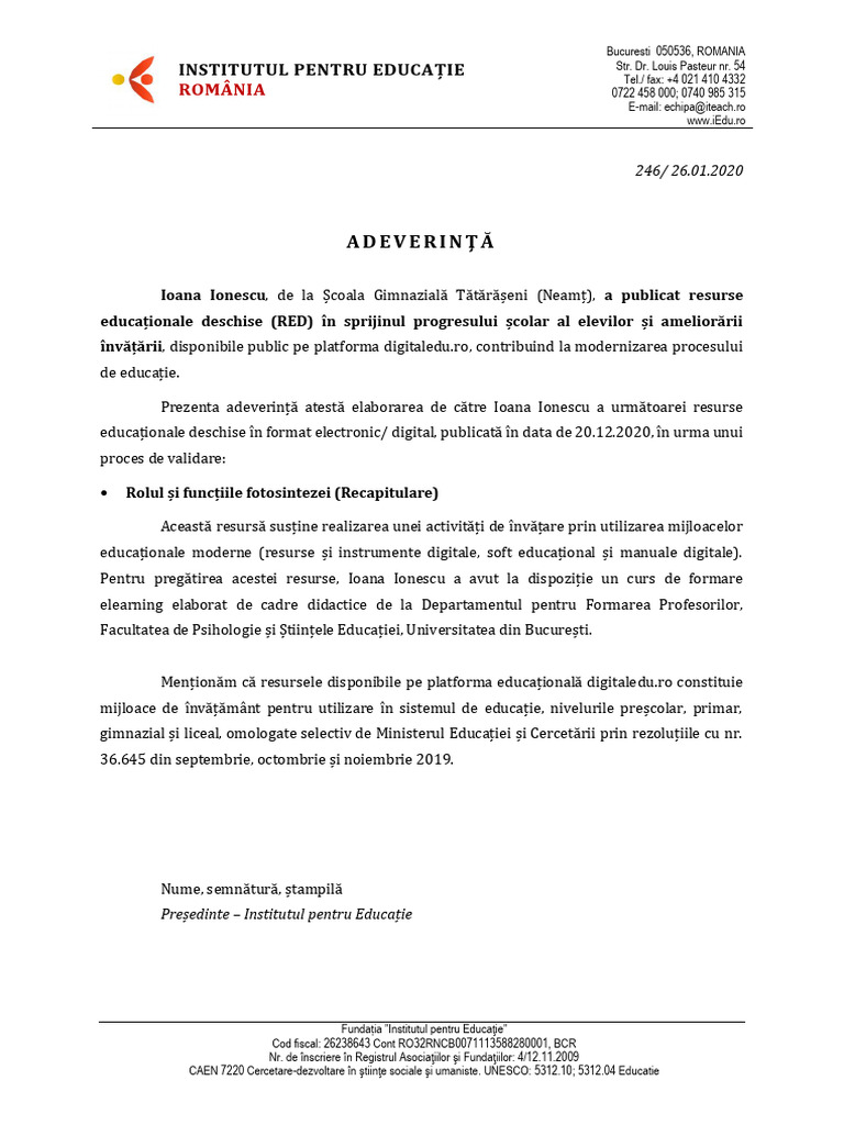Prezenta adeverință atestă elaborarea de către Ioana Ionescu a următoarei resurse