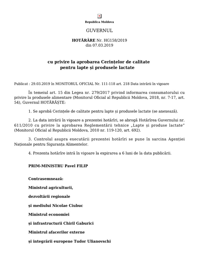 Cu Privire La Aprobarea Cerințelor de Calitate Pentru Lapte Și Produsele Lactate