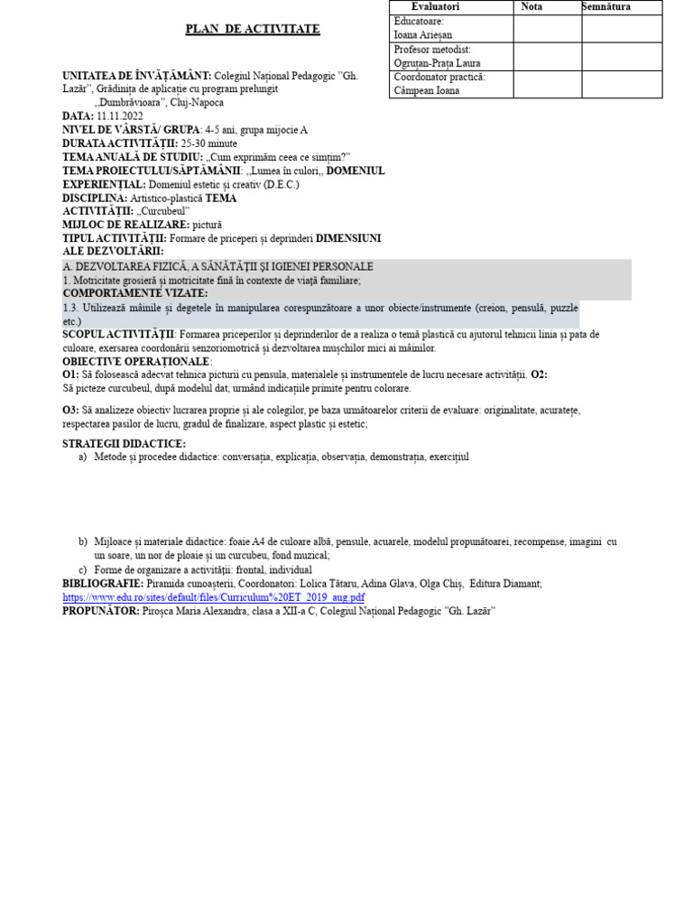 Lazăr”, Grădinița de aplicație cu program prelungit Câmpean Ioana