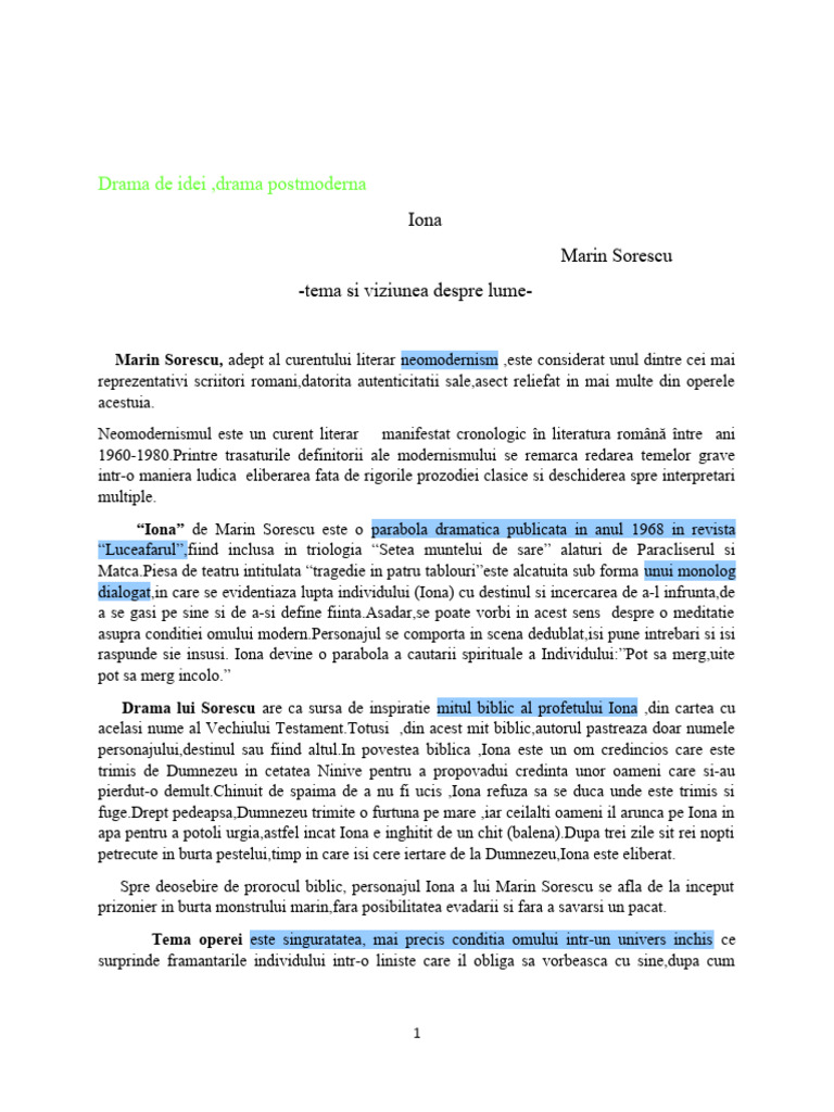 Opera literara, “Iona ‘” de Marin Sorescu devine reprezentativa pentru tema si viziunea