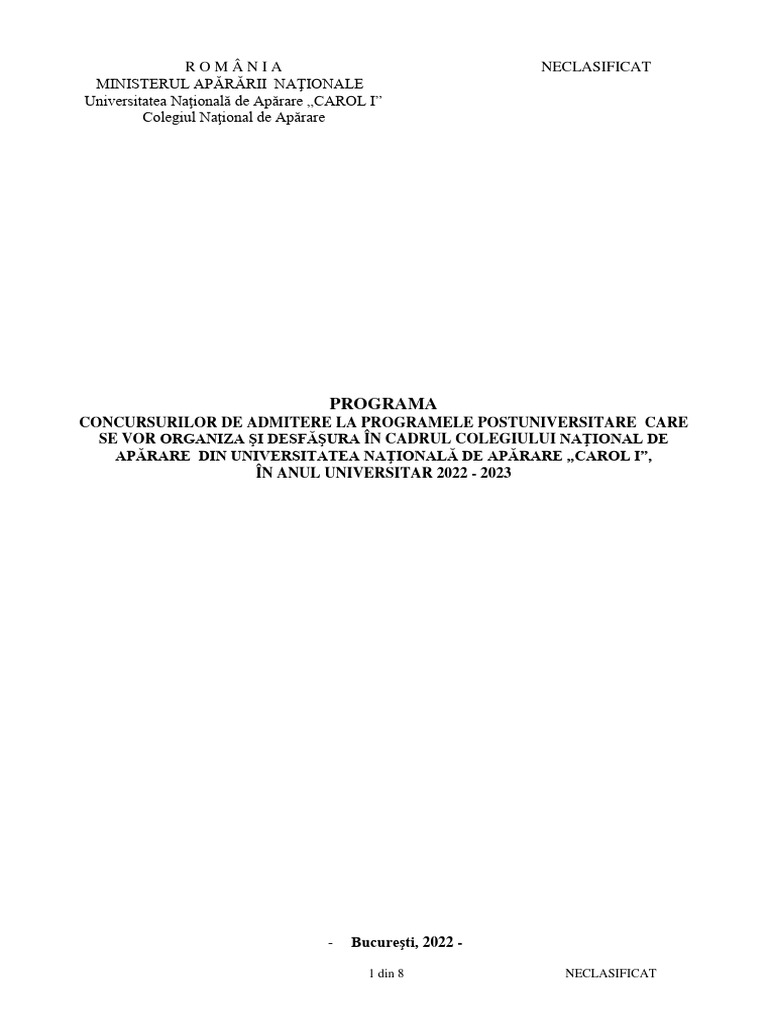 - Regulamentului de organizare şi desfăşurare a admiterii în Universitatea Naţională de Apărare