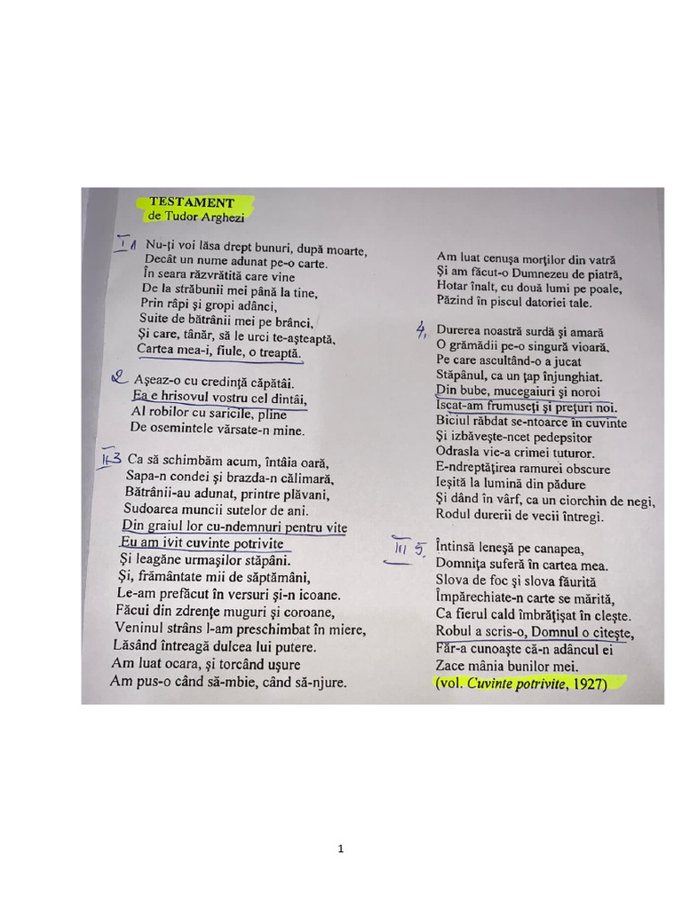 Poezia ,,Testament’’ de Tudor Arghezi, face parte din seria artelor poetice moderne ale