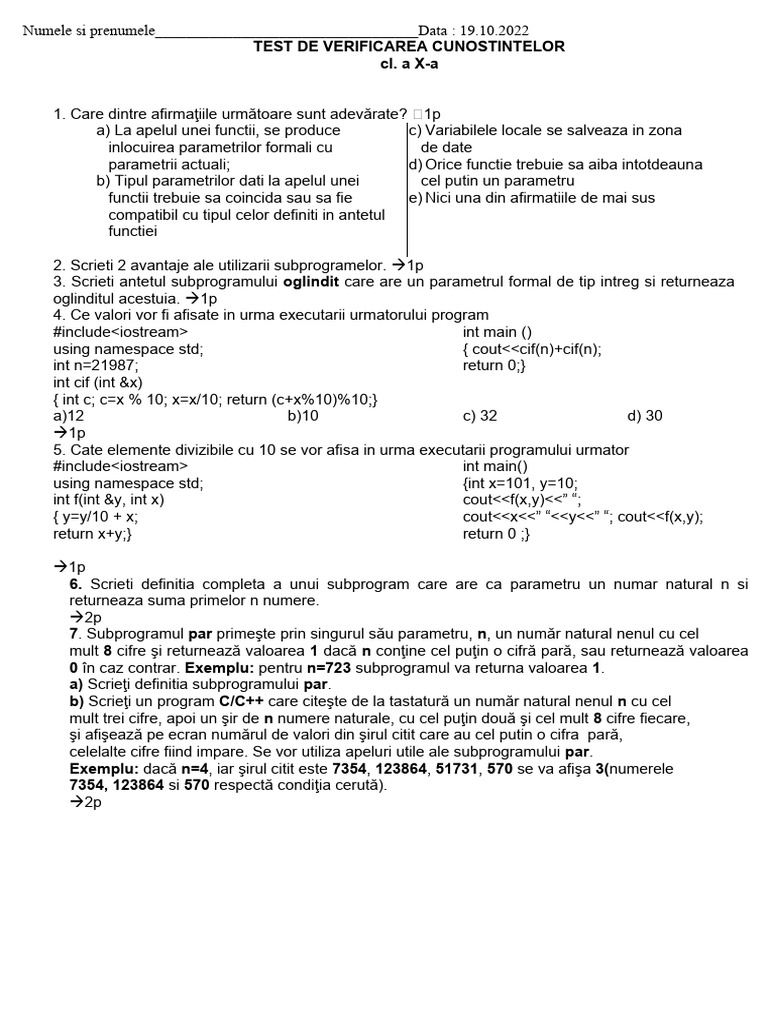 2. Scrieti 2 avantaje ale utilizarii subprogramelor. 1p