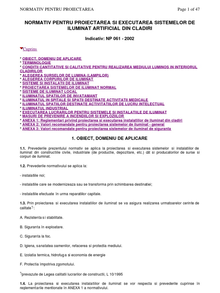 1.4. La proiectarea si executarea instalatiilor de iluminat se vor respecta si prevederile cuprinse n reglementarile mentionate n ANEXA 1 a normativului.