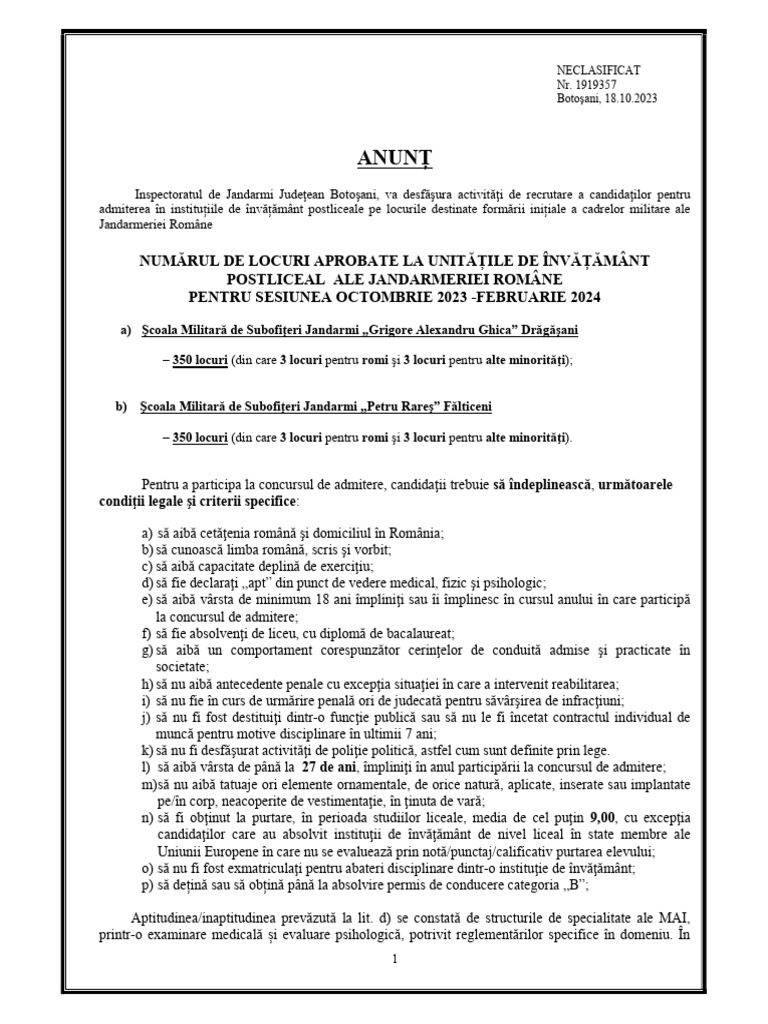 Jandarmi Județean Botoșani, cu privire la continuarea procedurilor de selecție și prezentarea la sediul