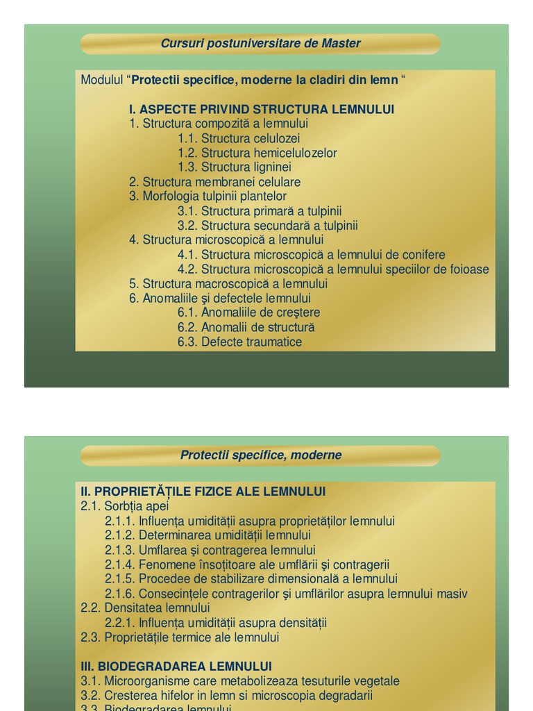 Protectii specifice, moderne II. PROPRIET ILE FIZICE ALE LEMNULUI 2.1. Sorb ia apei 2.1.1. Influen a umidit ii asupra propriet ilor lemnului 2.1.2. Determinarea umidit ii lemnului 2.1.3. Umflarea i contragerea lemnului 2.1.4. Fenomene nso itoare ale umflrii i contragerii 2.1.5. Procedee de stabilizare dimensional a lemnului 2.1.6. Consecin ele contragerilor i umflrilor asupra lemnului masiv 2.2. Densitatea lemnului 2.2.1. Influen a umidit ii asupra densit ii 2.3. Propriet ile termice ale lemnului III. BIODEGRADAREA LEMNULUI 3.1. Microorganisme care metabolizeaza tesuturile vegetale 3.2. Cresterea hifelor in lemn si microscopia degradarii 3.3. Biodegradarea lemnului 3.2.1. Biodegradarea celulozei 3.2.2. Biodegradarea hemicelulozelor 3.2.3. Biodegradarea ligninei