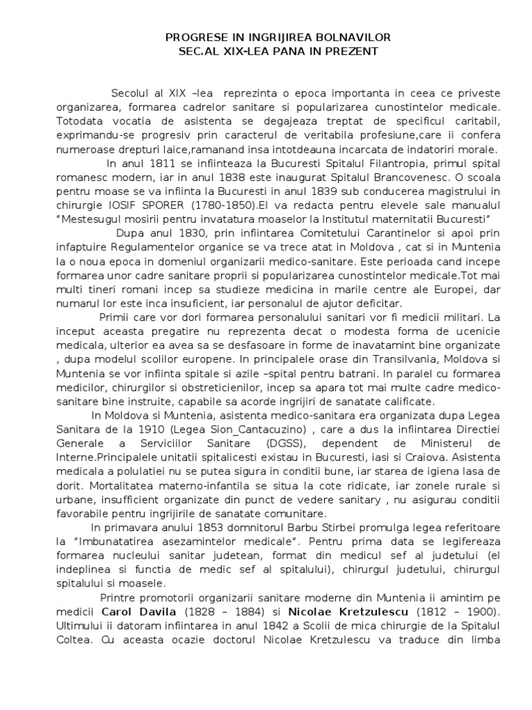 Secolul al XIX lea reprezinta o epoca importanta in ceea ce priveste organizarea, formarea cadrelor sanitare si popularizarea cunostintelor medicale. Totodata vocatia de asistenta se degajeaza treptat de specificul caritabil, exprimandu-se progresiv prin caracterul de veritabila profesiune,care ii confera numeroase drepturi laice,ramanand insa intotdeauna incarcata de indatoriri morale. In anul 1811 se infiinteaza la Bucuresti Spitalul Filantropia, primul spital romanesc modern, iar in anul 1838 este inaugurat Spitalul Brancovenesc. O scoala pentru moase se va infiinta la Bucuresti in anul 1839 sub conducerea magistrului in chirurgie IOSIF SPORER (1780-1850).El va redacta pentru elevele sale manualul Mestesugul mosirii pentru invatatura moaselor la Institutul maternitatii Bucuresti Dupa anul 1830, prin infiintarea Comitetului Carantinelor si apoi prin infaptuire Regulamentelor organice se va trece atat in Moldova , cat si in Muntenia la o noua epoca in domeniul organizarii medico-sanitare. Este perioada cand incepe formarea unor cadre sanitare proprii si popularizarea cunostintelor [Link] mai multi tineri romani incep sa studieze medicina in marile centre ale Europei, dar numarul lor este inca insuficient, iar personalul de ajutor deficitar. Primii care vor dori formarea personalului sanitari vor fi medicii militari. La inceput aceasta pregatire nu reprezenta decat o modesta forma de ucenicie medicala, ulterior ea avea sa se desfasoare in forme de inavatamint bine organizate , dupa modelul scolilor europene. In principalele orase din Transilvania, Moldova si Muntenia se vor infiinta spitale si azile spital pentru batrani. In paralel cu formarea medicilor, chirurgilor si obstreticienilor, incep sa apara tot mai multe cadre medicosanitare bine instruite, capabile sa acorde ingrijiri de sanatate calificate. In Moldova si Muntenia, asistenta medico-sanitara era organizata dupa Legea Sanitara de la 1910 (Legea Sion_Cantacuzino) , care a dus la infiintarea Directiei Generale a Serviciilor Sanitare (DGSS), dependent de Ministerul de [Link] unitatii spitalicesti existau in Bucuresti, iasi si Craiova. Asistenta medicala a polulatiei nu se putea sigura in conditii bune, iar starea de igiena lasa de dorit. Mortalitatea materno-infantila se situa la cote ridicate, iar zonele rurale si urbane, insufficient organizate din punct de vedere sanitary , nu asigurau conditii favorabile pentru ingrijirile de sanatate comunitare. In primavara anului 1853 domnitorul Barbu Stirbei promulga legea referitoare la Imbunatatirea asezamintelor medicale. Pentru prima data se legifereaza formarea nucleului sanitar judetean, format din medicul sef al judetului (el indeplinea si functia de medic sef al spitalului), chirurgul judetului, chirurgul spitalului si moasele. Printre promotorii organizarii sanitare moderne din Muntenia ii amintim pe medicii Carol Davila (1828 1884) si Nicolae Kretzulescu (1812 1900). Ultimului ii datoram infiintarea in anul 1842 a Scolii de mica chirurgie de la Spitalul Coltea. Cu aceasta ocazie doctorul Nicolae Kretzulescu va traduce din limba