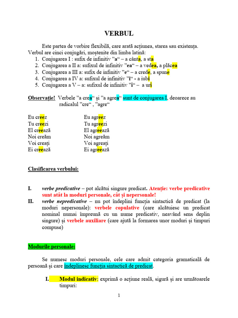 singure) și verbele auxiliare (care ajută la formarea unor moduri și timpuri