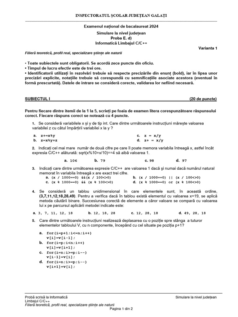 SUBIECTUL I (20 de puncte)