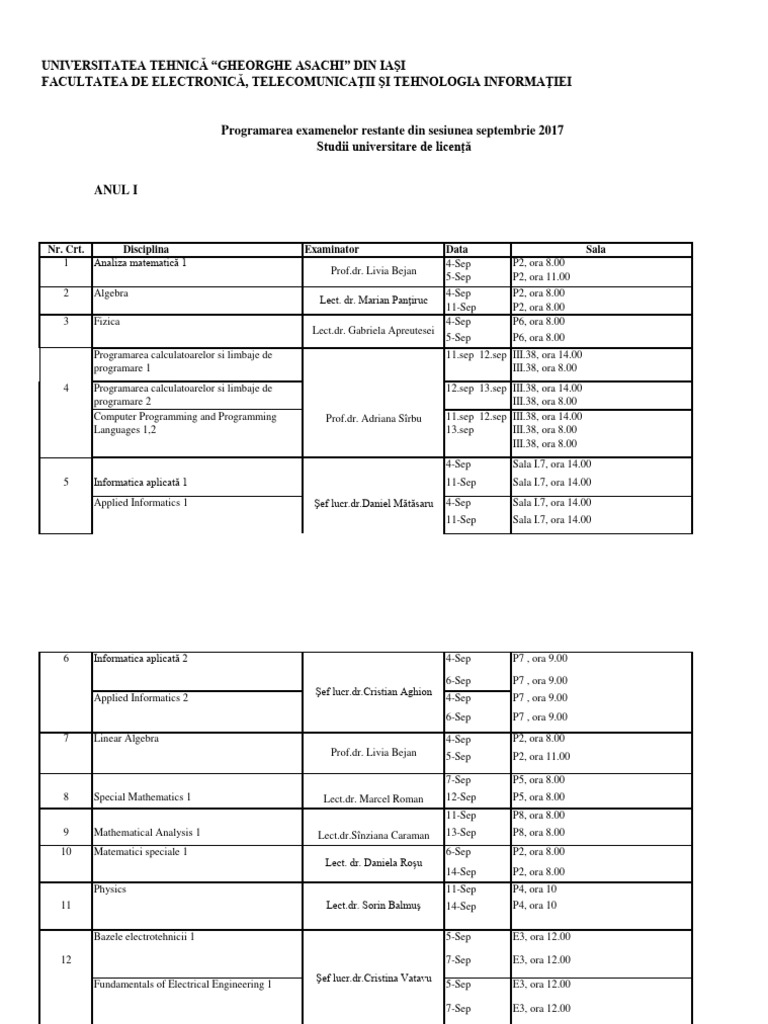 5-Sep Facultatea TPMI, TEX1, sala 308, ora 9.00