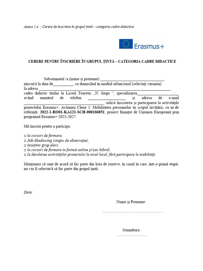 a - Cerere de înscriere în grupul țintă – categoria cadre didactice