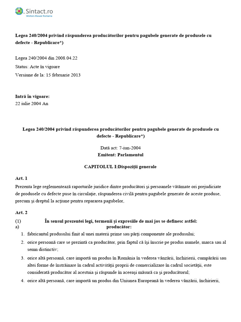 Legea nr. 240/2004 privind răspunderea producătorilor pentru pagubele generate de produsele cu defecte a
