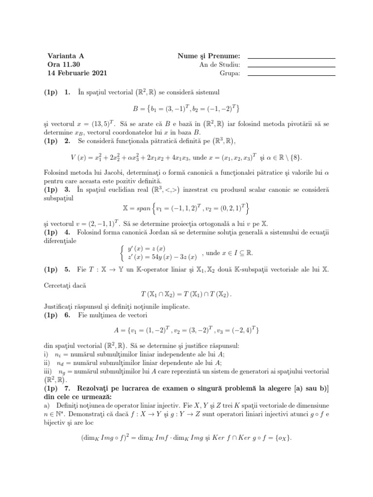Examen Algebră - Page 2 of 2 14 Februarie 2021