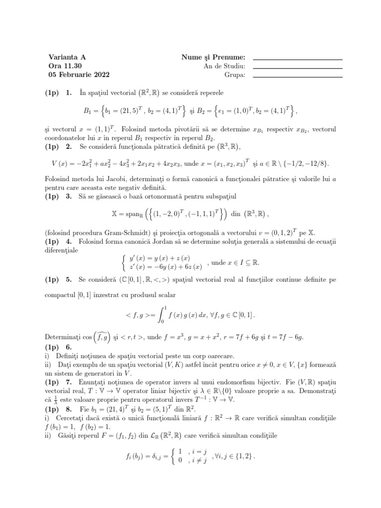 Examen Algebră - Page 2 of 2 05 Februarie 2022