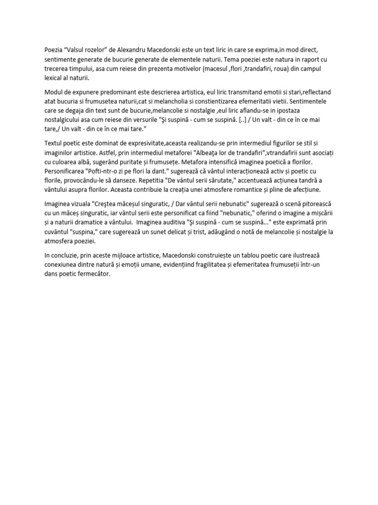 Poezia “Valsul rozelor” de Alexandru Macedonski este un text liric in care se exprima,in mod direct,