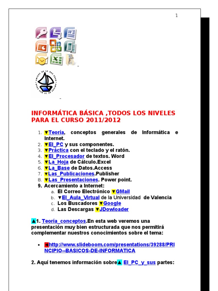 Internet. El_PC y sus componentes. Prctica con el teclado y el ratn. El_Procesador de textos. Word La_Hoja de Clculo.Excel La_Base de Datos.Access Las_Publicaciones.Publisher Las_Presentaciones. Power point. Acercamiento a Internet: a. El Correo Electrnico GMail b. El_Aula_Virtual de la Universidad de Valencia c. Los Buscadores Google d. Las Descargas JDowloader