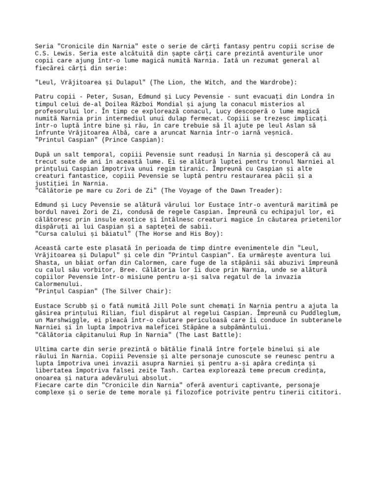 C.S. Lewis. Seria este alcătuită din șapte cărți care prezintă aventurile unor