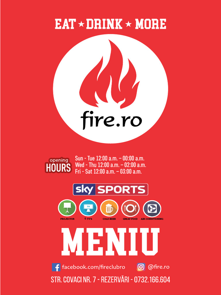maioneză) / (sesame bun, green salad, Fire Club’s own fresh beef burger with spices prosciutto crudo 12 lei