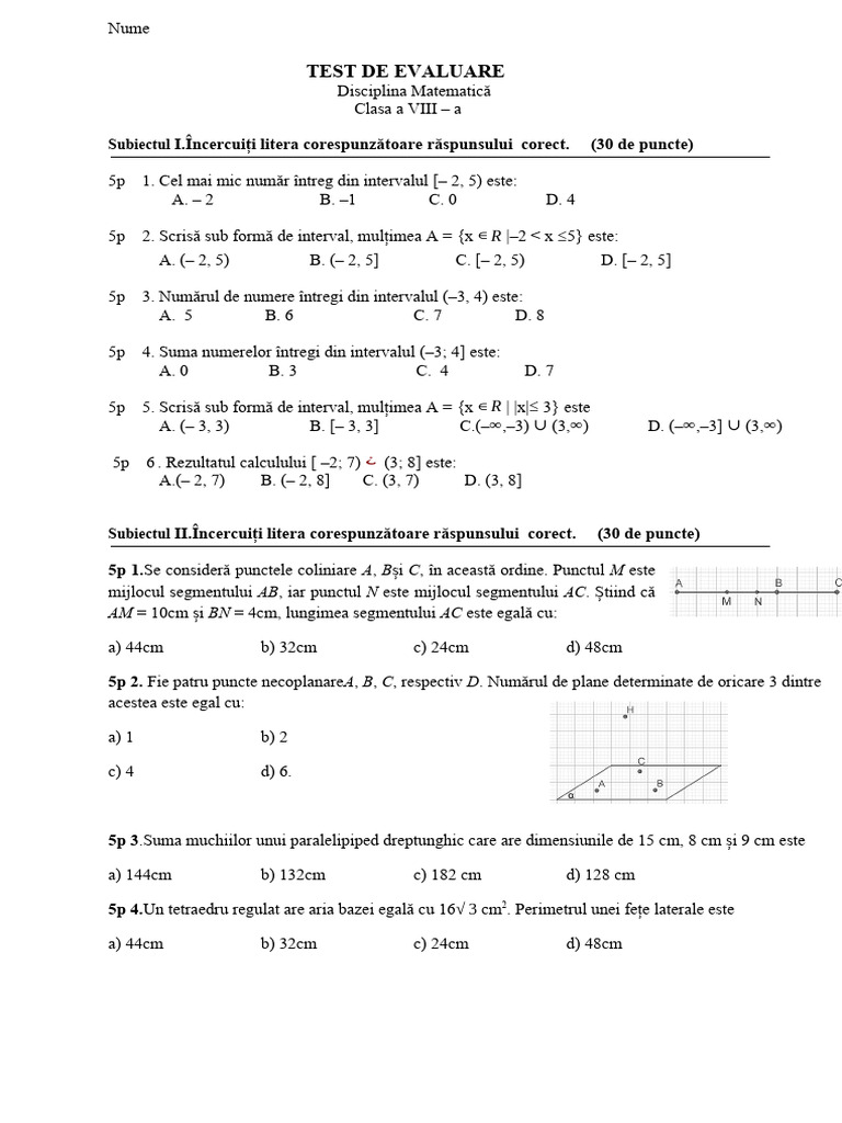5p 5. Scrisă sub formă de interval, mulțimea A = {x ∈ R | |x|≤ 3} este