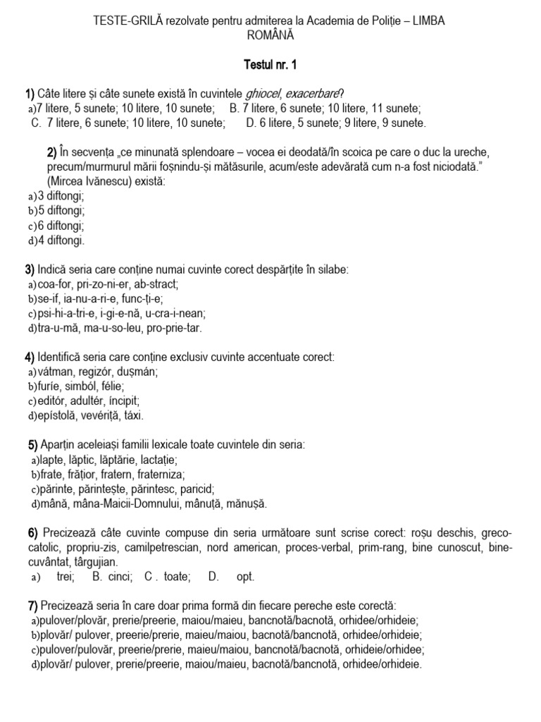 TESTE-GRILĂ rezolvate pentru admiterea la Academia de Poliție – LIMBA