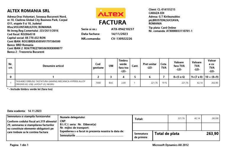 Cod fiscal: RO2864518 Data factura: 14/11/2023