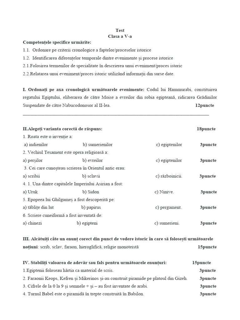 I. 12 puncte pentru ordinea corectă pe axa cronologică: 1. constituirea regatului Egiptului (3000