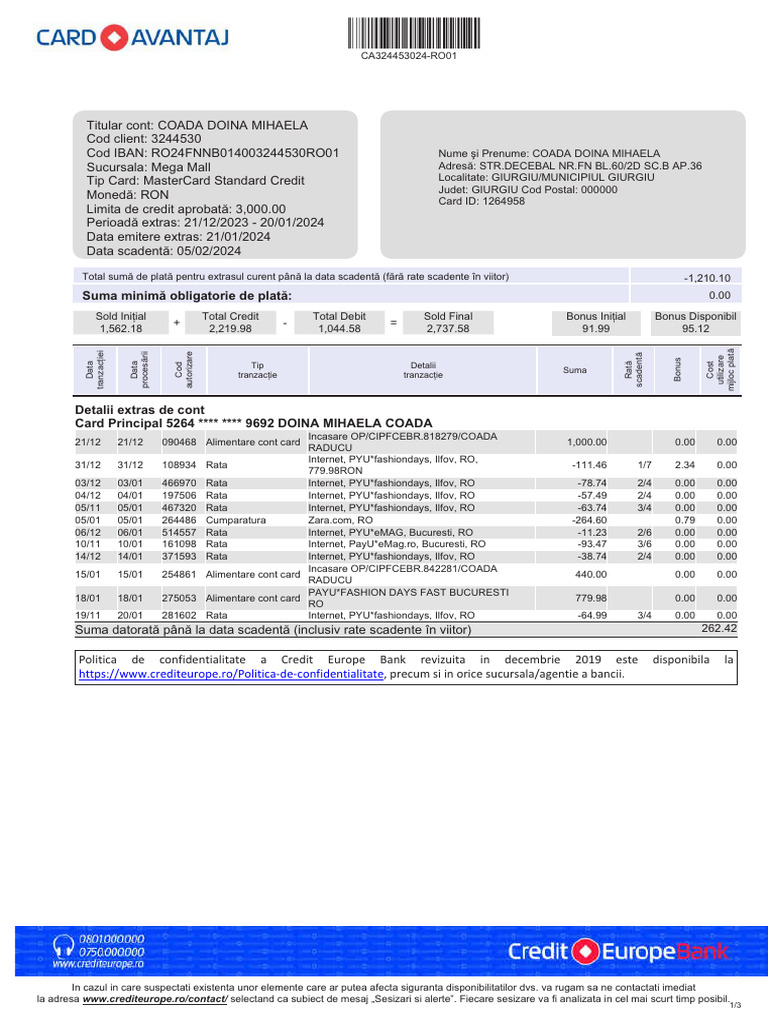 veţi rambursa suma minimă de plată, Credit Europe Bank (Romania) S.A. va transmite datele dvs. şi situaţia creditului către