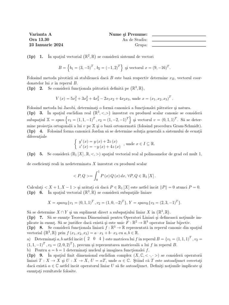 (1p) 8. Se consideră funcţionala liniară f : R3 → R reprezentată ı̂n reperul canonic din spaţiul