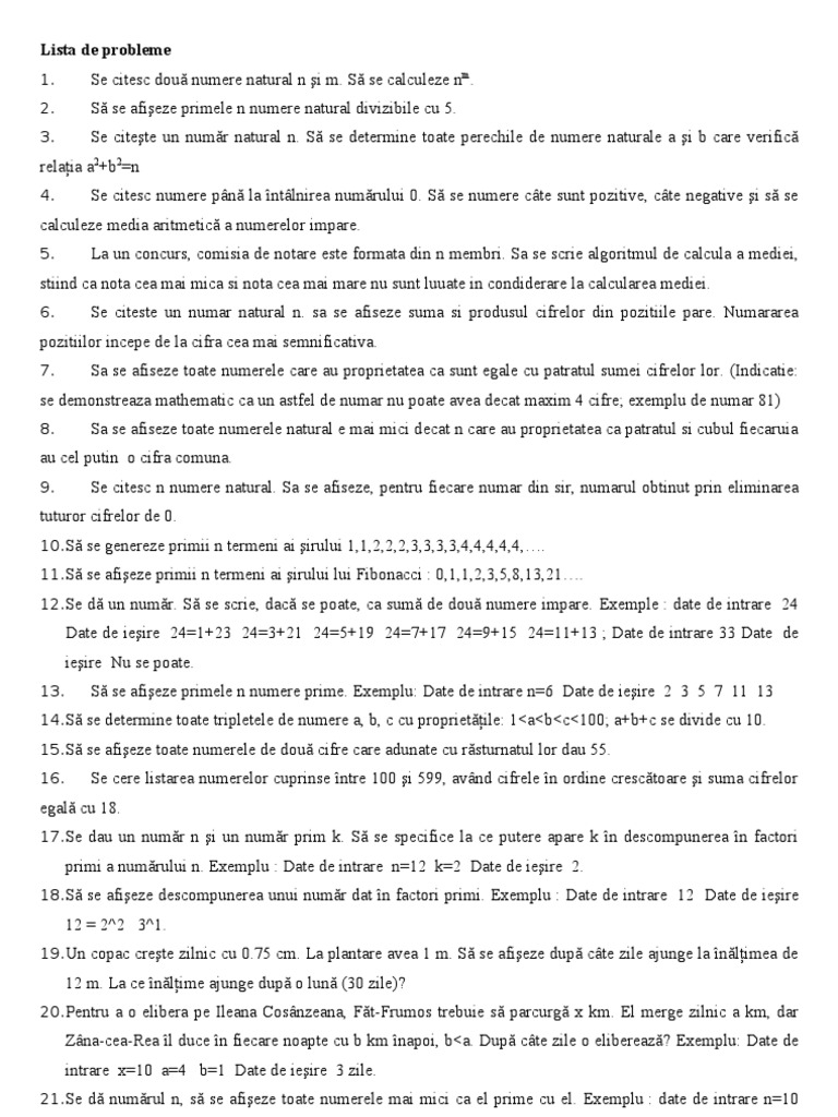44. Se sitete un ir de numere ntregi pn cnd se introduce de dou ori consecutiv aceeai valoare. S se afieze cte ptrate perfecte sunt n ir. Exemplu: Dac irul este 13 9 56 400 8 17 25 25, acesta conine 4 ptrate perfecte (numerele 9, 400, 25 i 25). 45. Un numr natural se numete perfect dac el este egal cu suma divizorilor si mai mici dect el. S se verifice dac un numr n este perfect sau nu. Exemplu: Pentru n=28 este numr perfect deoarece 28=1+2+4+7+14. 46. Un numr natural se numete perfect dac el este egal cu suma divizorilor si mai mici dect el. S se determine toate numerele perfecte mai mici dect 10000. 47. S se afle toate numerele naturale mai mici dect 2000, care mprite la 24, 30, 18 dau restul 7. Exemplu: 1447:24=60 rest 7; 1447:30=48 rest 7; 1447:48=80 rest 7. 48. S se determine dac dou numere sunt prime ntre ele sau nu. Dou numere naturale sunt prime ntre ele dac cel mai mare divizor comun al lor este 1. Exemplu: 15 i 38 sunt numere prime ntre ele. 49. Se citesc n numere ntregi de la tastatur. S se afieze suma primelor m numere negative. Dac numrul de numere negative este mai mic de m atunci se vaafia suma tuturor numerelor negative din ir.