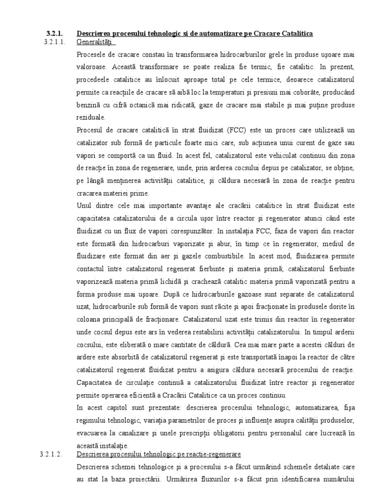 Descrierea procesului tehnologic si de automatizare pe Cracare Catalitica Generaliti Procesele de cracare constau n transformarea hidrocarburilor grele n produse uoare mai valoroase. Aceast transformare se poate realiza fie termic, fie catalitic. In prezent, procedeele catalitice au nlocuit aproape total pe cele termice, deoarece catalizatorul permite ca reaciile de cracare s aib loc la temperaturi i presiuni mai coborte, producnd benzin cu cifr octanic mai ridicat, gaze de cracare mai stabile i mai puine produse reziduale. Procesul de cracare catalitic n strat fluidizat (FCC) este un proces care utilizeaz un catalizator sub form de particule foarte mici care, sub aciunea unui curent de gaze sau vapori se comport ca un fluid. In acest fel, catalizatorul este vehiculat continuu din zona de reacie n zona de regenerare, unde, prin arderea cocsului depus pe catalizator, se obine, pe lng meninerea activitii catalitice, i cldura necesar n zona de reacie pentru cracarea materiei prime. Unul dintre cele mai importante avantaje ale cracrii catalitice n strat fluidizat este capacitatea catalizatorului de a circula uor ntre reactor i regenerator atunci cnd este fluidizat cu un flux de vapori corespunztor. In instalaia FCC, faza de vapori din reactor este format din hidrocarburi vaporizate i abur, n timp ce n regenerator, mediul de fluidizare este format din aer i gazele combustibile. In acest mod, fluidizarea permite contactul ntre catalizatorul regenerat fierbinte i materia prim; catalizatorul fierbinte vaporizeaz materia prim lichid i cracheaz catalitic materia prim vaporizat pentru a forma produse mai uoare. Dup ce hidrocarburile gazoase sunt separate de catalizatorul uzat, hidrocarburile sub form de vapori sunt rcite i apoi fracionate n produsele dorite n coloana principal de fracionare. Catalizatorul uzat este trimis din reactor n regenerator unde cocsul depus este ars n vederea restabilirii activitii catalizatorului. In timpul arderii cocsului, este eliberat o mare cantitate de cldur. Cea mai mare parte a acestei clduri de ardere este absorbit de catalizatorul regenerat i este transportat napoi la reactor de ctre catalizatorul regenerat fluidizat pentru a asigura cldura necesar procesului de reacie. Capacitatea de circulaie continu a catalizatorului fluidizat ntre reactor i regenerator permite operarea eficient a Cracrii Catalitice ca un proces continuu. In acest capitol sunt prezentate: descrierea procesului tehnologic, automatizarea, fia regimului tehnologic, variaia parametrilor de proces i influene asupra calitii produselor, evacuarea la canalizare i unele prescripii obligatorii pentru personalul care lucreaz n aceast instalaie. Descrierea procesului tehnologic pe reactie-regenerare Descrierea schemei tehnologice i a procesului s-a fcut urmrind schemele detaliate care au stat la baza proiectrii. Urmrirea fluxurilor s-a fcut prin identificarea numrului