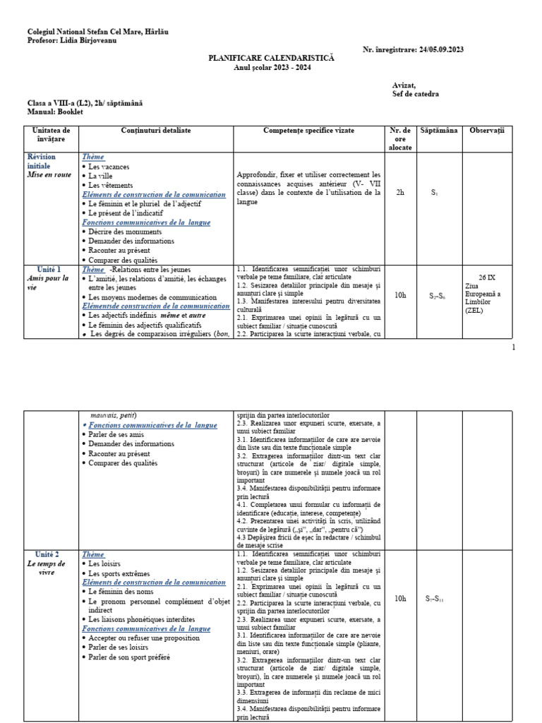 Unitatea de Conţinuturi detaliate Competenţe specifice vizate Nr. de Săptămâna Observaţii