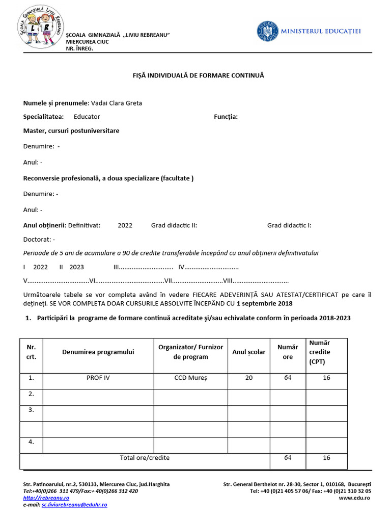 FIŞĂ INDIVIDUALĂ DE FORMARE CONTINUĂ
