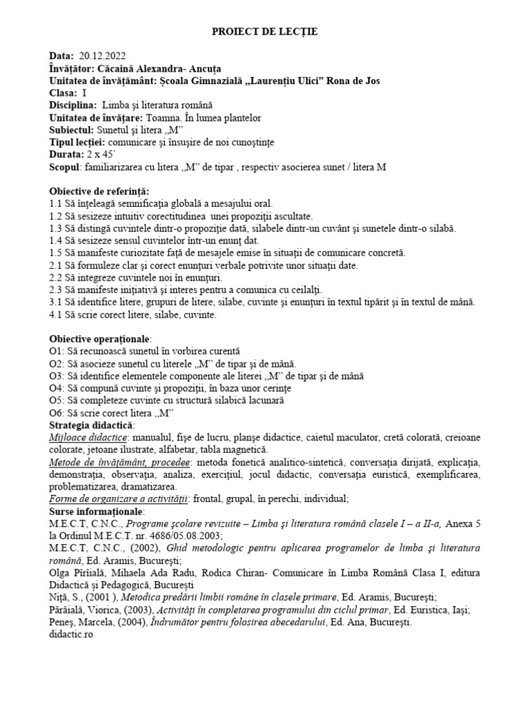 temei noi şi a lecţiei noi şi se comunică rezultatele care se aşteptă de la Explicaţia litera m sistematică