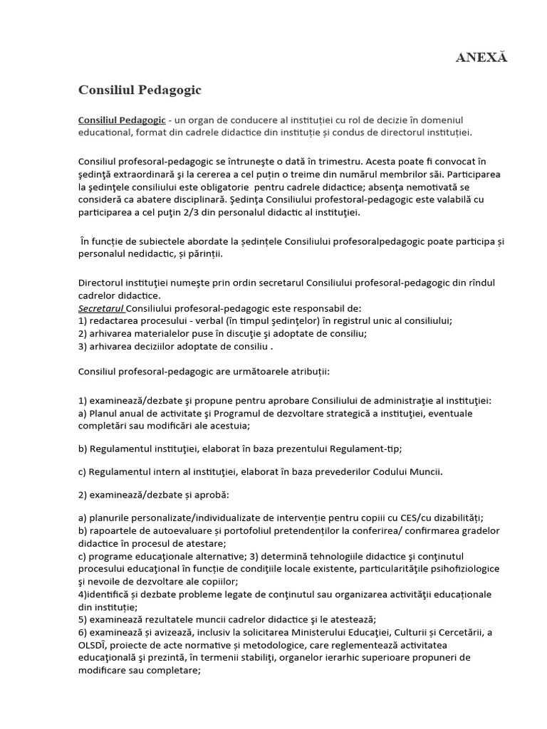 desfășurat, deciziile luate . Președintele și secretarul consiliului pedagogic aplică protocolul