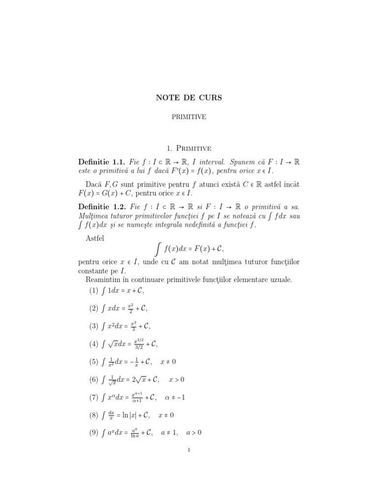 Definitie 1.2. Fie f ∶ I ⊂ R → R si F ∶ I → R o primitivă a sa.