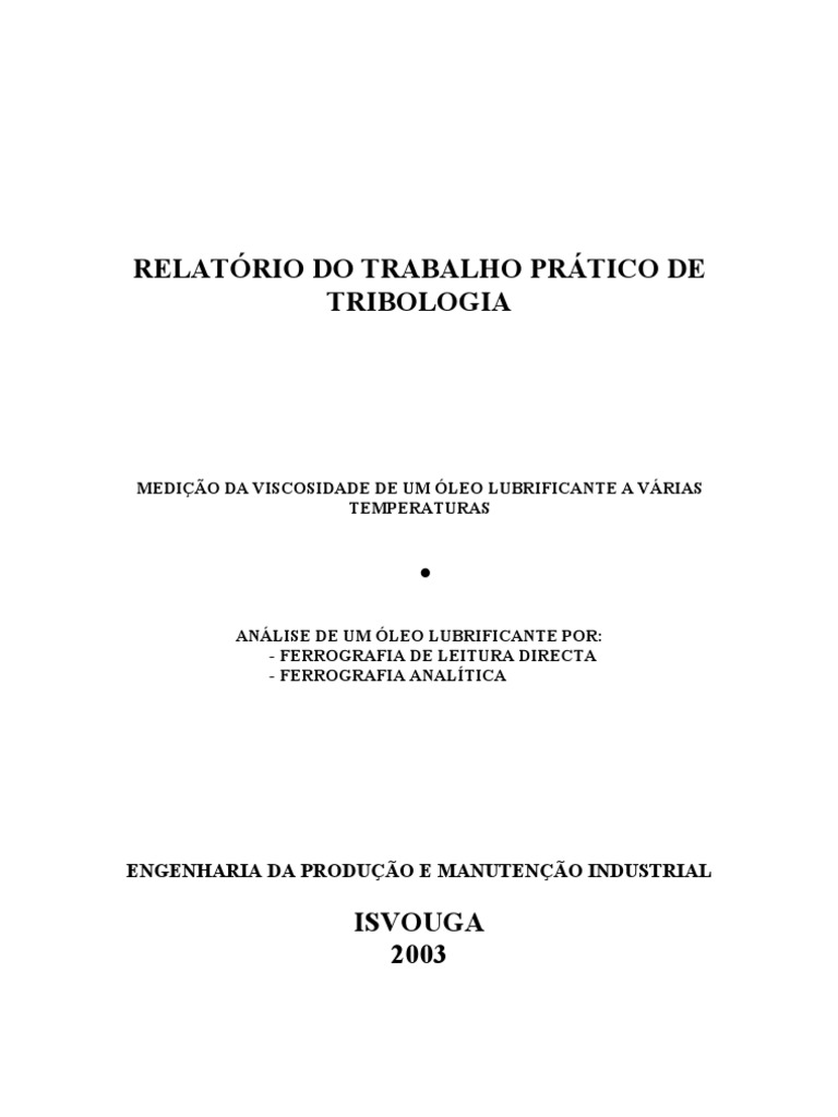 Graa, B.; Seabra, J.; "Anlise de Lubrificantes Princpios Bsicos", Novembro de 2002 Graa, B.; Castro, J.; Seabra, J.; Trabalhos Prticos de Tribologia, 2001