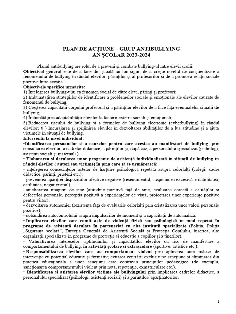 PLAN DE ACȚIUNE – GRUP ANTIBULLYING