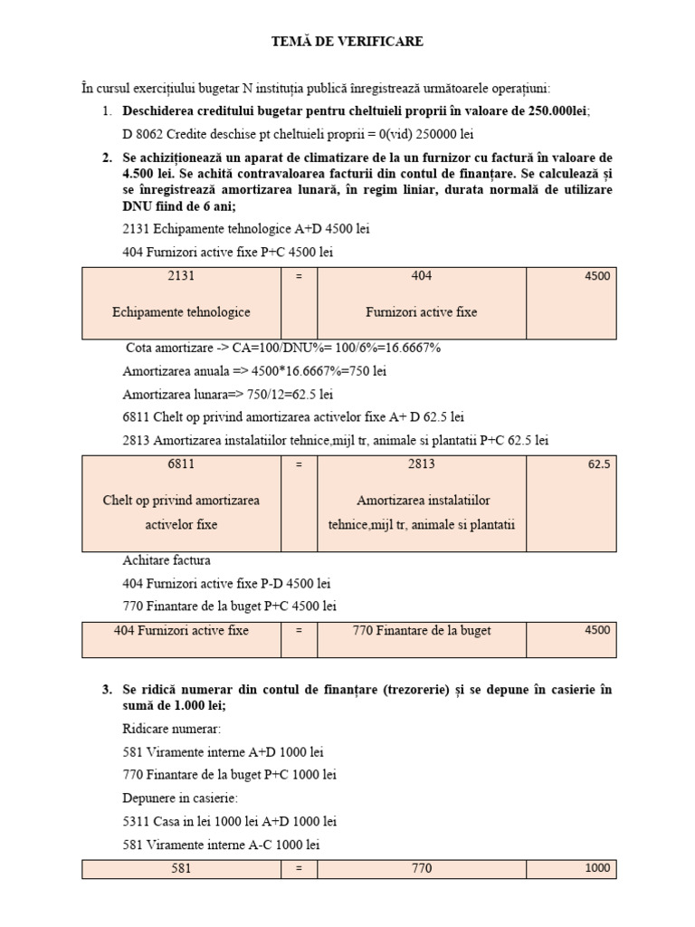 În cursul exercițiului bugetar N instituția publică înregistrează următoarele operațiuni: