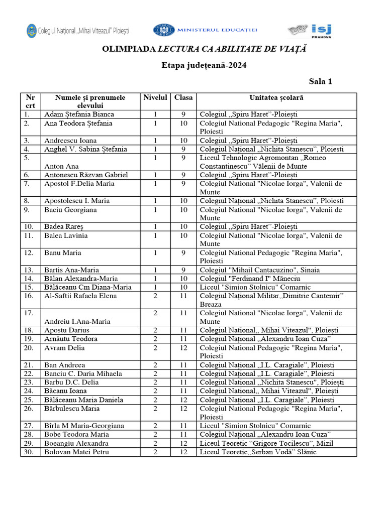 Nr Numele și prenumele Nivelul Clasa Unitatea școlară