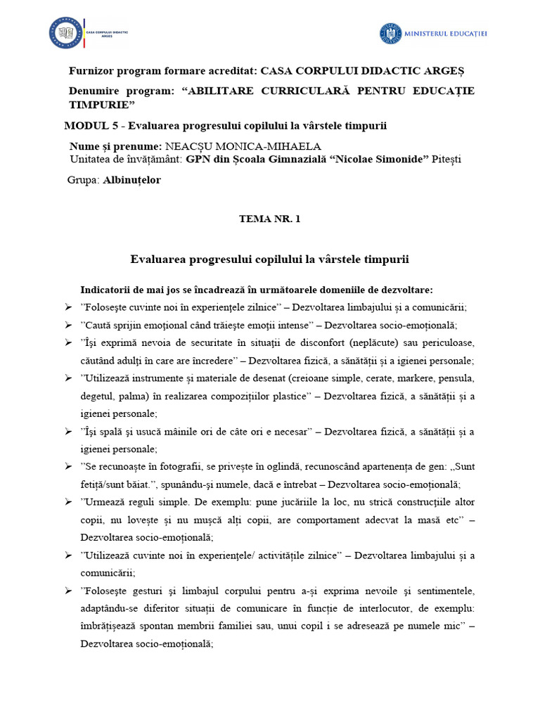 MODUL 5 - Evaluarea progresului copilului la vârstele timpurii