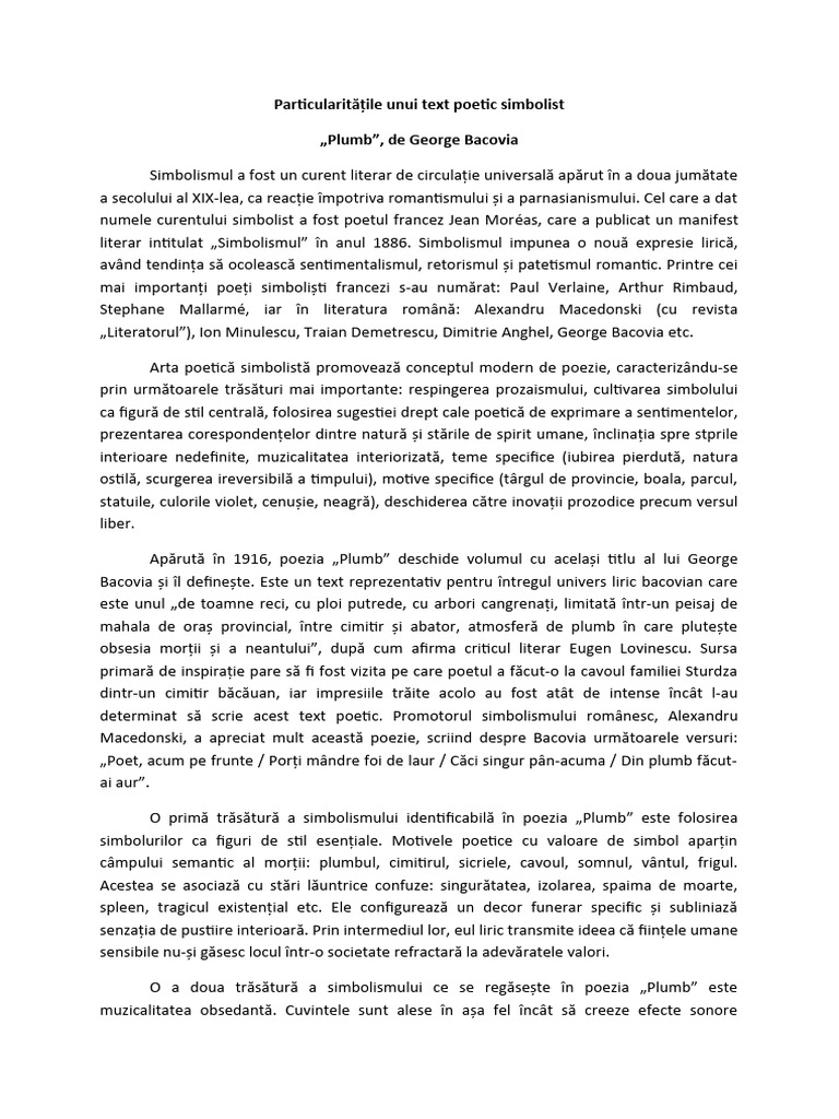 Prin atmosfera generală, simboluri, corespondențe, sugestie și muzicalitate, „Plumb” devine