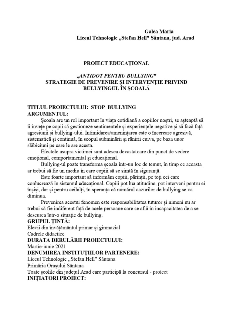 desfășurate și desene/expoziție de desene realizate de elevi pe tema bullying-ului.