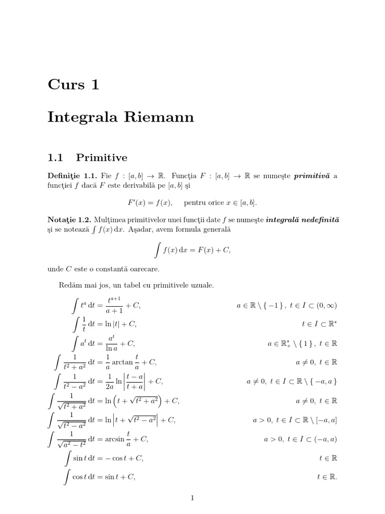 Definiţie 1.1. Fie f : [a, b] → R. Funcţia F : [a, b] → R se numeşte primitivă a