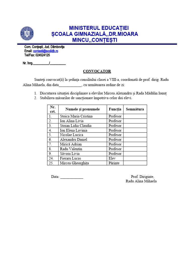 Sunteţi convocat(ă) la şedinţa consiliului clasei a VIII-a, coordonată de prof. dirig. Radu