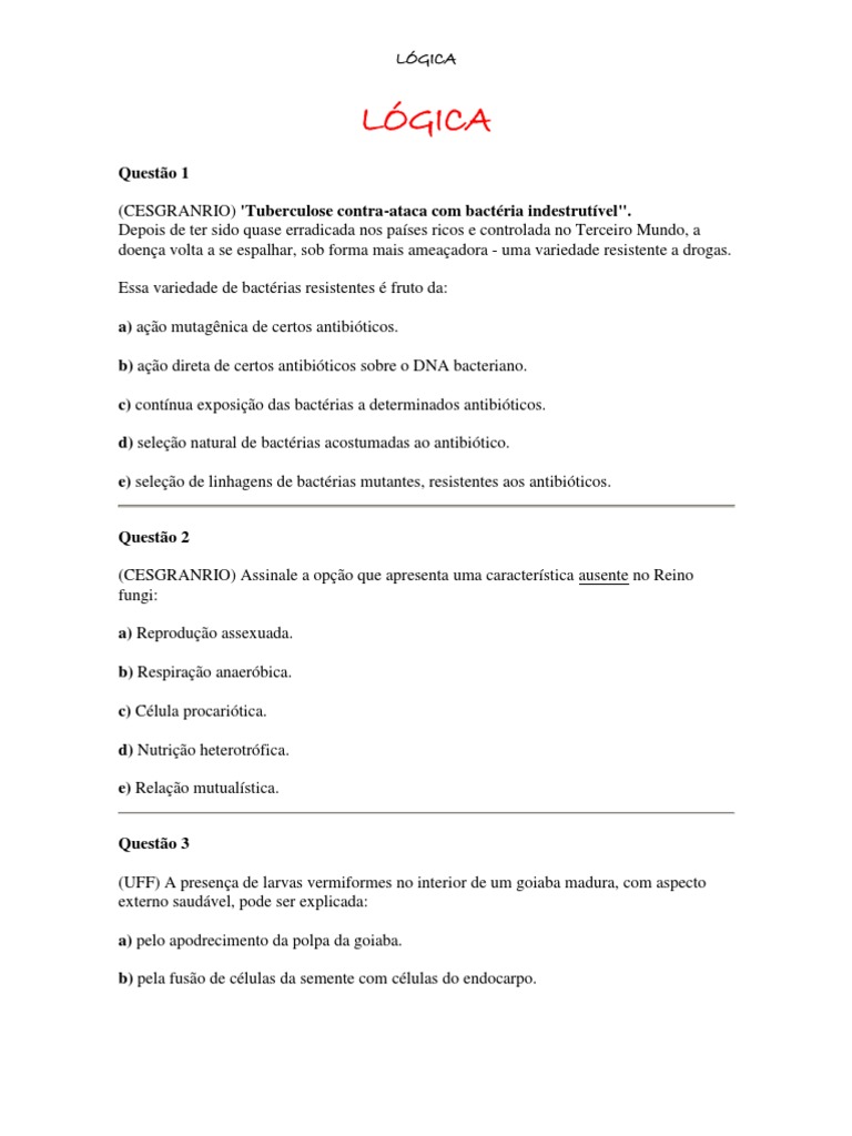 Questo 1 (CESGRANRIO) 'Tuberculose contra-ataca com bactria indestrutvel". Depois de ter sido quase erradicada nos pases ricos e controlada no Terceiro Mundo, a doena volta a se espalhar, sob forma mais ameaadora - uma variedade resistente a drogas. Essa variedade de bactrias resistentes fruto da: a) ao mutagnica de certos antibiticos. b) ao direta de certos antibiticos sobre o DNA bacteriano. c) contnua exposio das bactrias a determinados antibiticos. d) seleo natural de bactrias acostumadas ao antibitico. e) seleo de linhagens de bactrias mutantes, resistentes aos antibiticos. Questo 2 (CESGRANRIO) Assinale a opo que apresenta uma caracterstica ausente no Reino fungi: a) Reproduo assexuada. b) Respirao anaerbica. c) Clula procaritica. d) Nutrio heterotrfica. e) Relao mutualstica. Questo 3 (UFF) A presena de larvas vermiformes no interior de um goiaba madura, com aspecto externo saudvel, pode ser explicada: a) pelo apodrecimento da polpa da goiaba. b) pela fuso de clulas da semente com clulas do endocarpo.